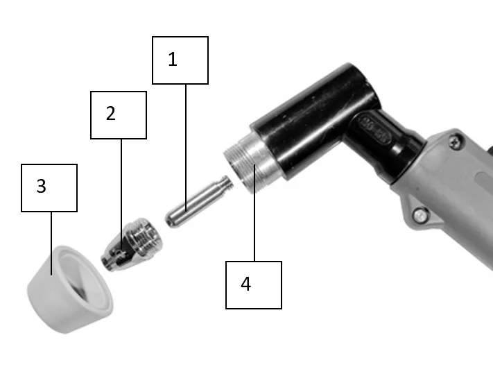 Во-первых, правильно установите катод, сопло и защитный колпачок резака (см. руководство по резаку на следующем рисунке). Соедините резак и обратный кабель в соответствии со  следующими указаниями.